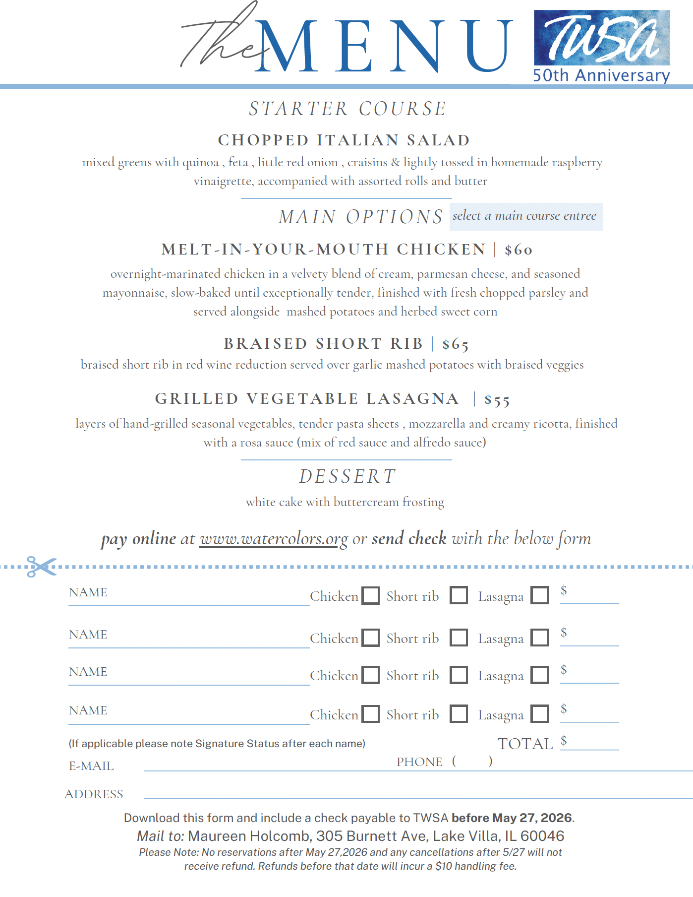 Please Note: No reservations after May 27th, 2026, and any cancellations after 5/27 will not receive a refund. Refunds before that date will incur a $10 handling fee.